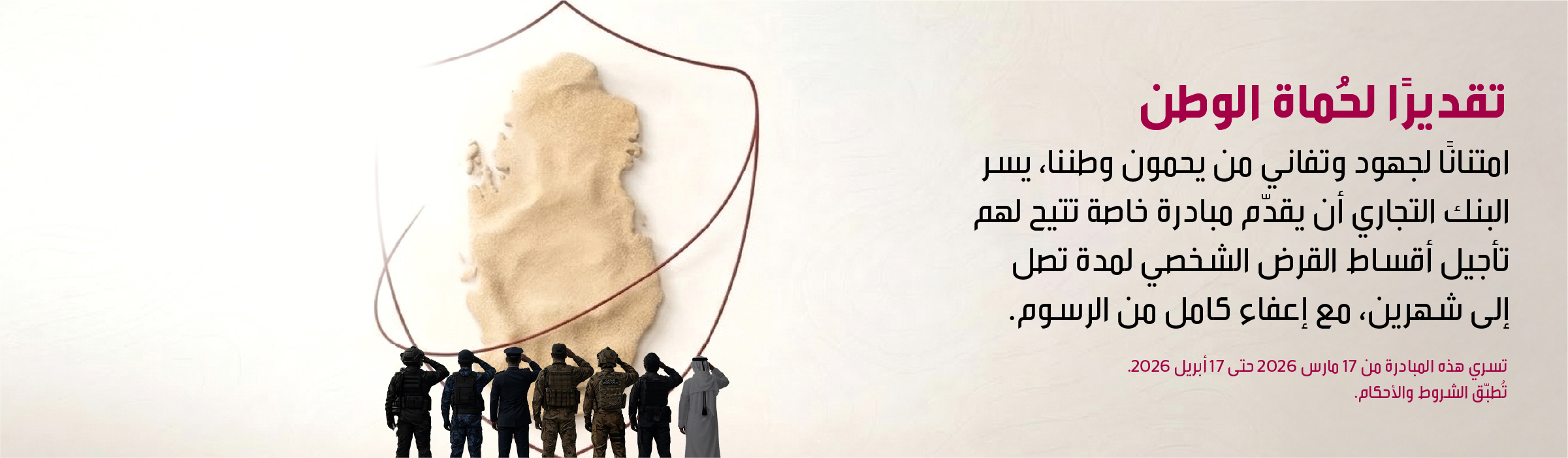 وفي البنك التجاري، نعتز بالوقوف إلى جانب من يكرّسون جهودهم لحماية وطننا وشعبه. وتقديرًا لخدمتهم وتفانيهم في أداء واجبهم الوطني، نُطلق مبادرة خاصة تتيح تأجيل أقساط القرض الشخصي لمدة تصل إلى شهرين، مع إعفاء كامل من الرسوم.