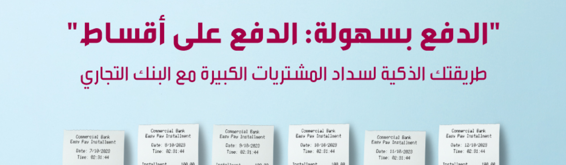 مرحبًا بك في خدمة "الدفع بسهولة: الدفع على أقساط"- الحل الذكي والمريح لسداد جميع مشترياتك الكبيرة! مع ميزة "الدفع بسهولة: الدفع على أقساط"، يمكنك الآن تحويل أي عملية شراء تمّت باستخدام بطاقتك الائتمانية من البنك التجاري وتزيد عن 500 ريال قطري إلى أقساط مريحة على 3 أشهر أو 6 أشهر أو 12 شهرًا.