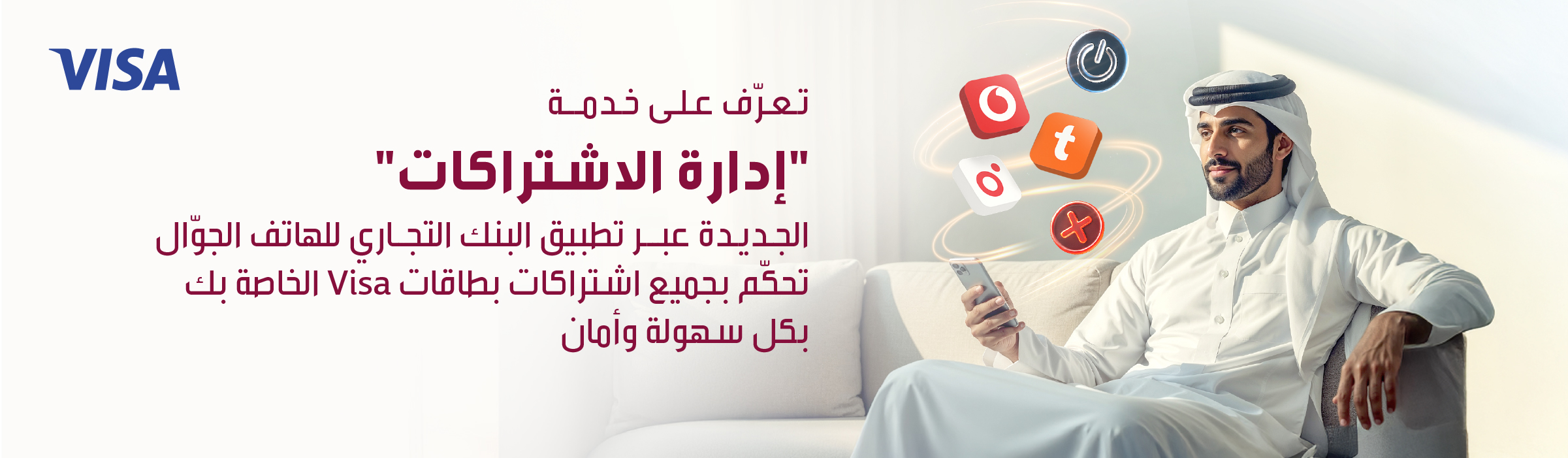 وانطلاقًا من ذلك، يسرّنا أن نُقدم لك خدمة "إدارة الاشتراكات" الجديدة عبر تطبيق البنك التجاري للهاتف الجوّال، وهي ميزة متطورة تتيح لك تحكمًا كاملًا في المدفوعات المتكررة التي تتم باستخدام بطاقة الخصم أو البطاقة الائتمانية من Visa الخاصة بك.