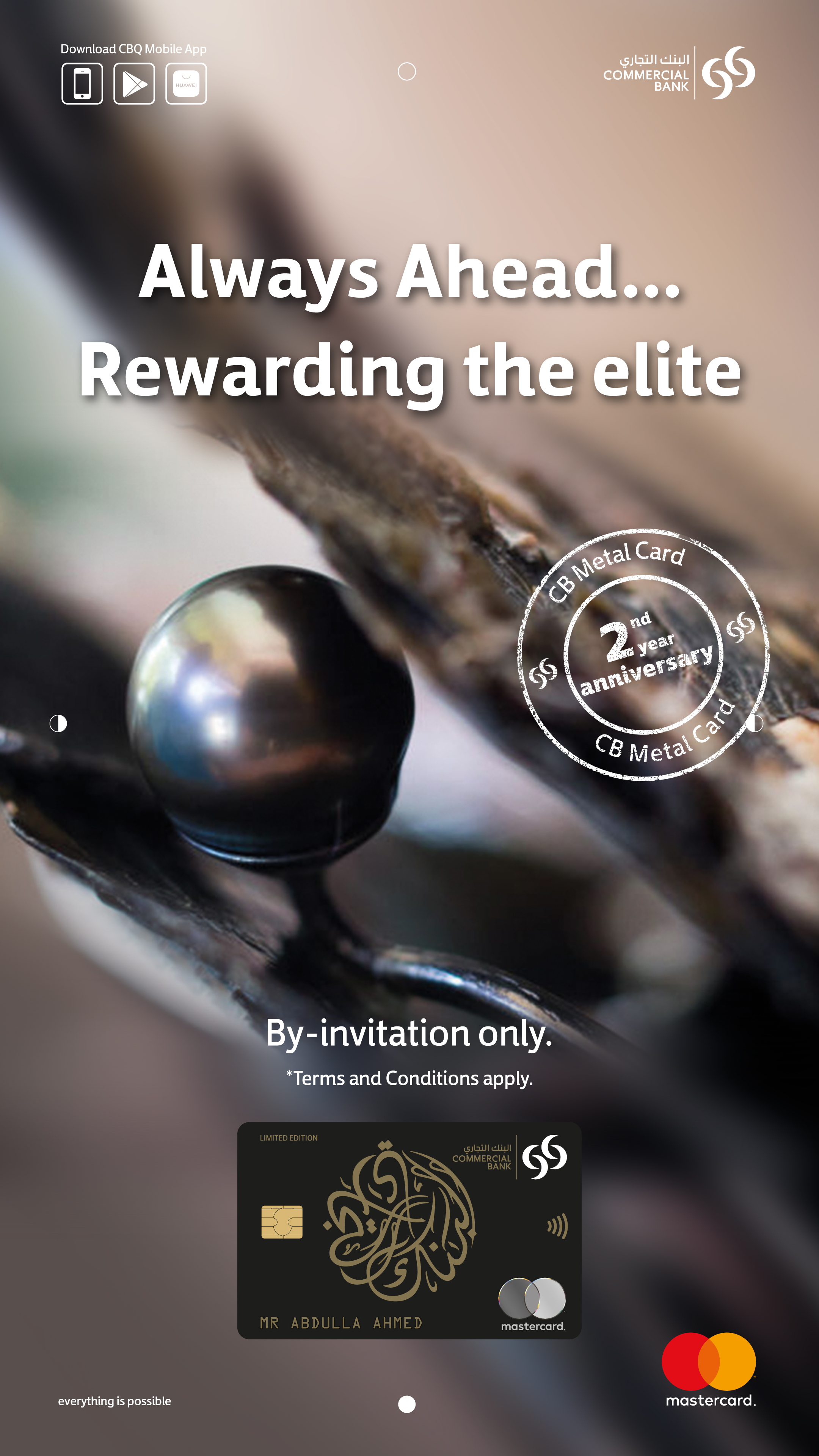 To learn more about our Limited Edition Credit Card privileges and benefits, visit https://www.cbq.qa/EN/Personal/Rewards/LimitedEdition/Pages/Welcome.aspx