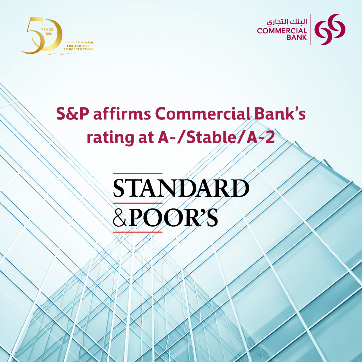 Joseph Abraham, Group Chief Executive Officer of Commercial Bank said: “The rating affirmation with a stable outlook by S&P reflects our Bank's well-established corporate franchise in Qatar. With the strong position of Qatar's government and economy, the enduring strength of Commercial Bank's balance sheet has resulted in sound earnings generation capacity."