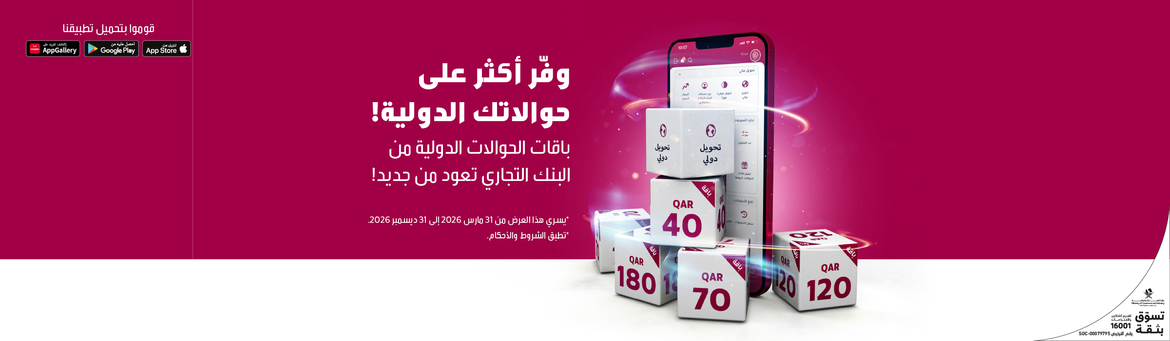حمّل تطبيق البنك التجاري للهاتف الجوال الحائز على الجوائز، واستمتع بخدمة تحويل الأموال الدولية بأسعار صرف تنافسية.