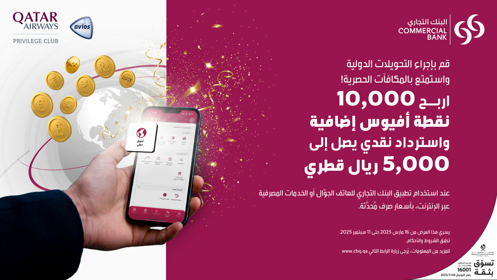 الدوحة، قطر–20 مايو 2025: أعلن البنك التجاري، البنك الرّائد في الحلول المصرفية الرقمية المبتكرة في قطر، عن شراكته الجديدة مع نادي الامتياز التابع للخطوط الجوية القطرية، بهدف مكافأة عملاء البنك التجاري بنقاط أفيوس إضافية عند إجراء الحوالات الدولية عبر تطبيق البنك التجاري للهاتف الجوّال أو الخدمات المصرفية عبر الإنترنت.يمنح هذا العرض المحدود، والذي يستمر من 16 مارس حتى 11 سبتمبر 2025، عملاء البنك التجاري فرصة الدخول في السحب ليكونوا من بين 600 فائز محظوظ يحصل كل منهم على 10,000 نقطة أفيوس إضافية عند إجراء حوالة دولية.