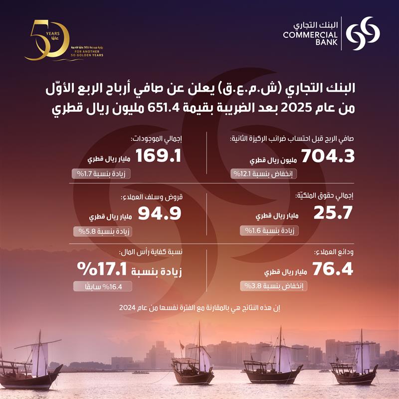 أعلن البنك التجاري (ش.م.ع.ق) ("البنك") وشركاته التابعة والزميلة ("المجموعة") اليوم عن نتائجه الماليّة للأشهر الثلاثة المنتهية في 31 مارس 2025.