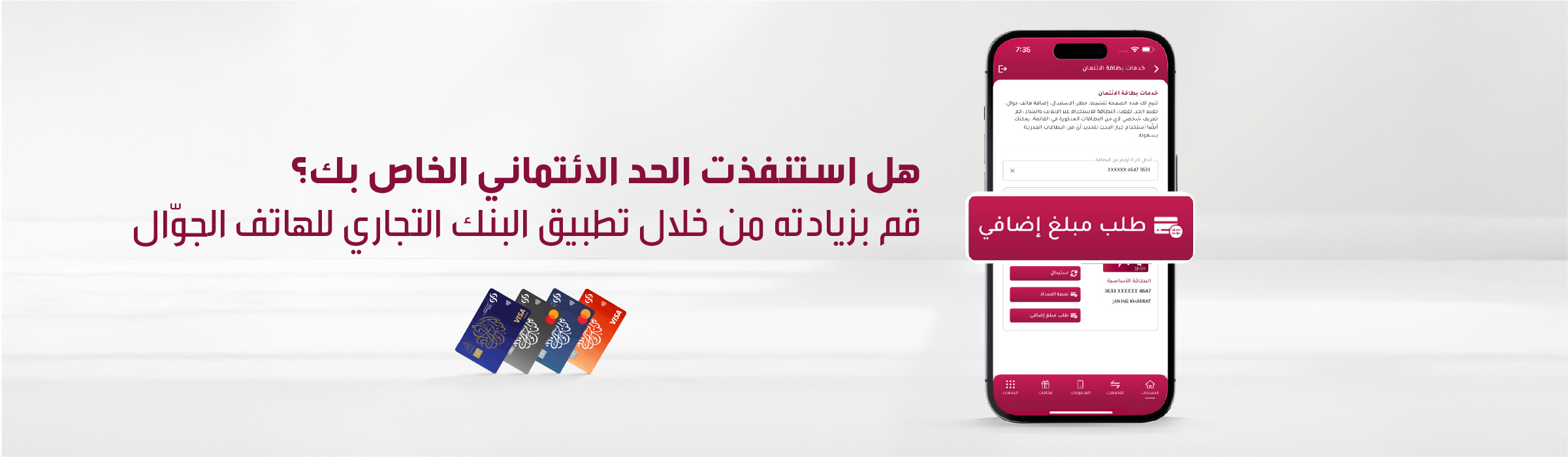 للحصول على حد ائتماني إضافي مؤقت، كل ما عليك فعله هو اتباع الخطوات التالية على تطبيق البنك التجاري للهاتف الجوّال: