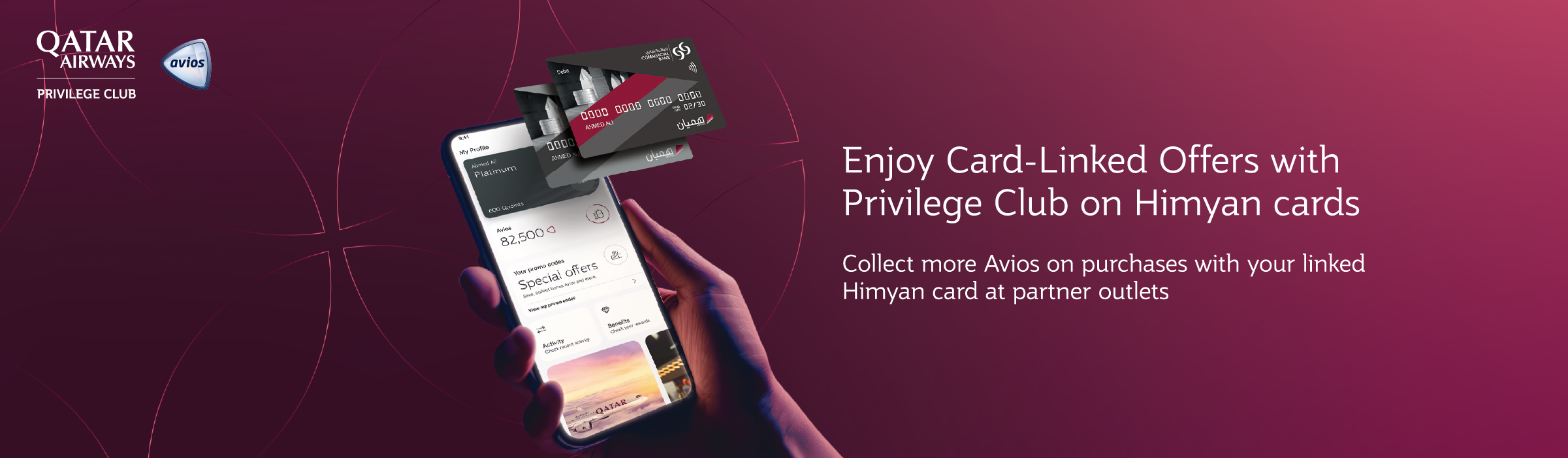 Spending with Himyan cards is now more rewarding. You will collect 1 Avios with Qatar Airways Privilege Club for every QAR 8 spent with a Himyan card. Additionally, you will also benefit from Card-Linked Offers and collect even more Avios on purchases with linked Himyan card at partner outlets.