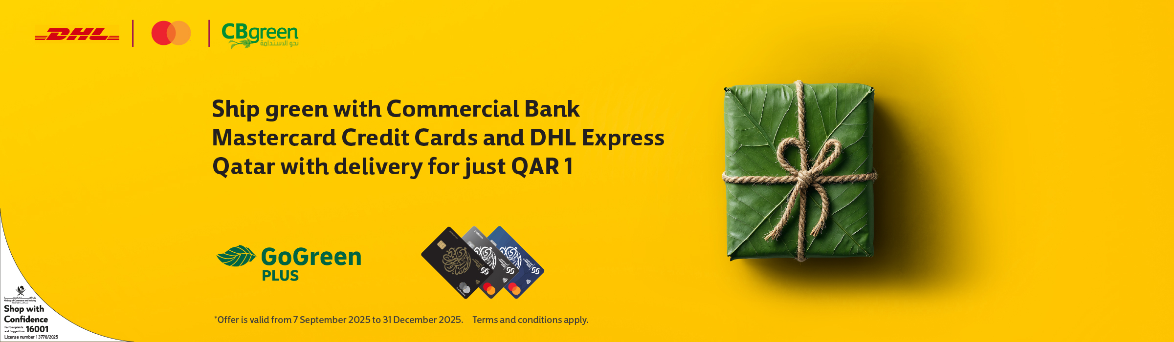 Commercial Bank has partnered with DHL Express Qatar so you can contribute to a greener future. You can now ship internationally (up to 1 kg) for just QAR 1 with DHL's GoGreen Plus when you use your Commercial Bank Credit Cards. This offer is valid for one shipment per cardholder.
