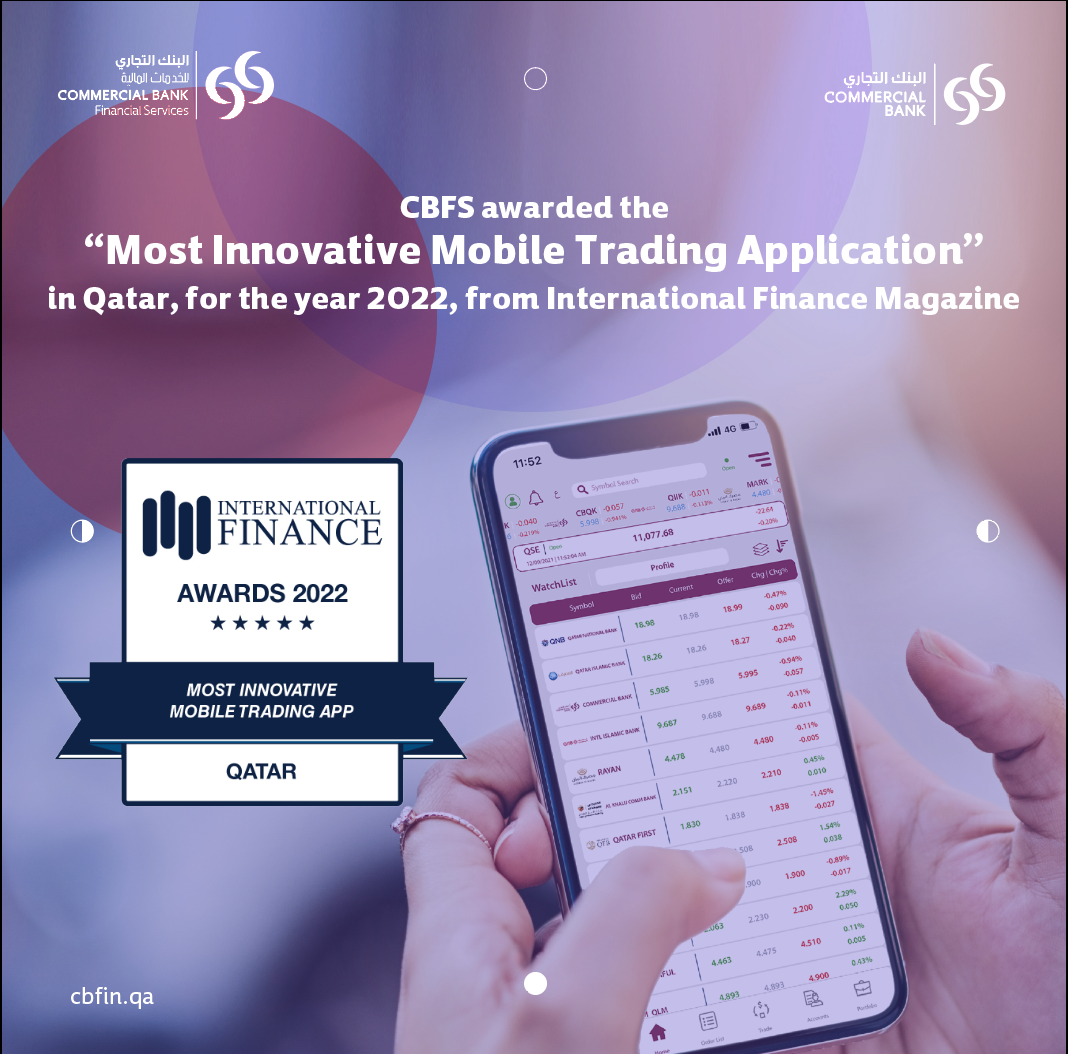 Doha, Qatar: August 15, 2022: Commercial Bank Financial Services LLC., a fully owned subsidiary company of Commercial Bank Group, has received the “Most Innovative Mobile Trading Application" award in Qatar, for the year of 2022, from the London-based global financial publication, International Finance Magazine, the second consecutive year.