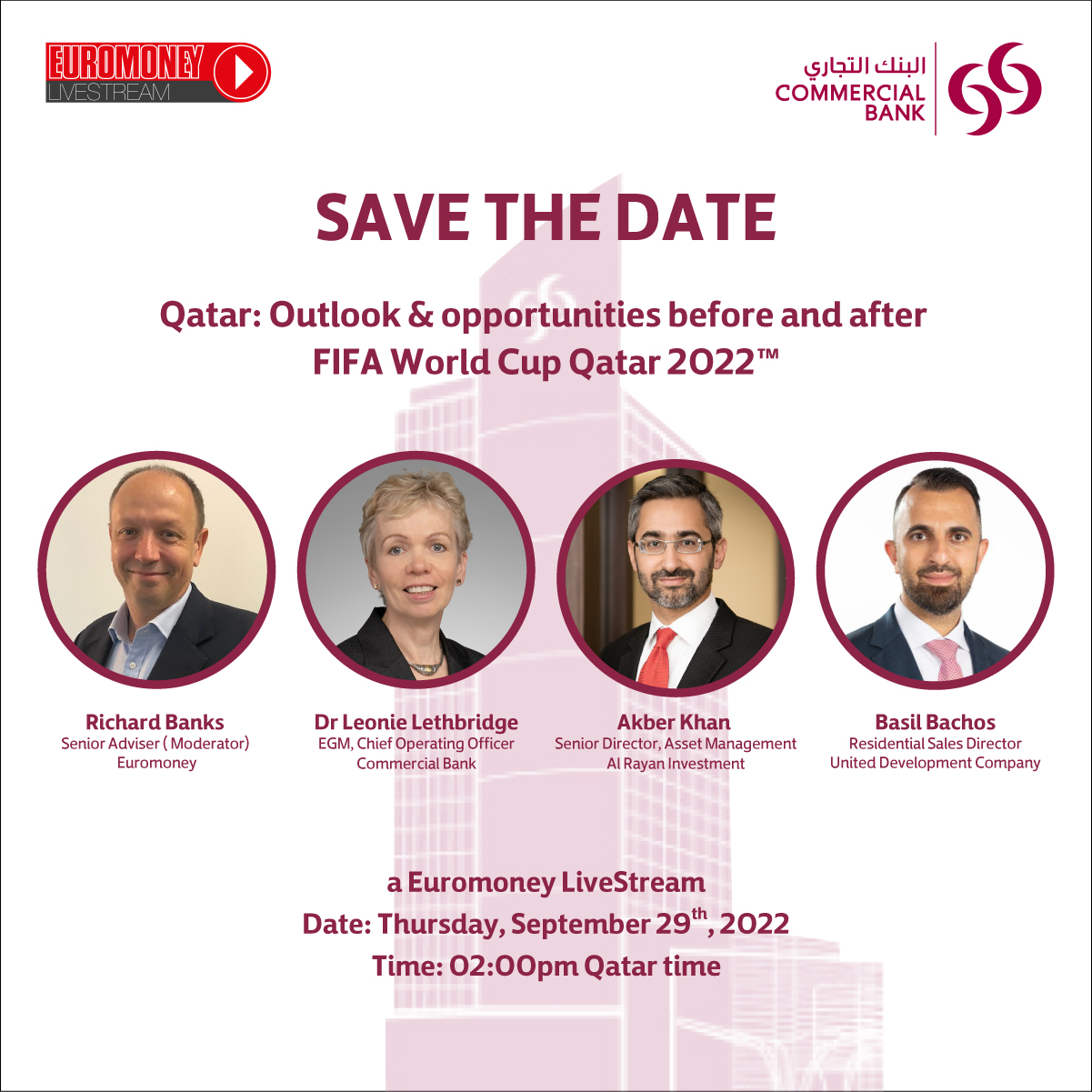 Doha, Qatar: September 26, 2022: Commercial Bank joins hands with Euromoney to present on Thursday, September 29th, 2022 at 2pm Doha time, “Qatar: Outlook and opportunities before and after FIFA World Cup Qatar 2022™", an online Euromoney Livestream where key speakers from the Bank and others will share their perspectives on what the World Cup means for Qatar, for its businesses and for its allocation of capital on the global markets.