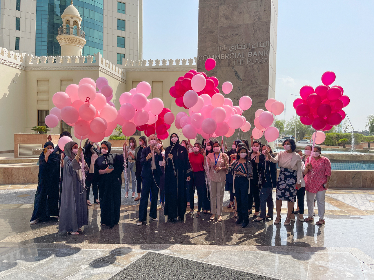Commercial Bank is keen on providing its employees with the necessary information that can help in raising awareness on breast cancer. To accomplish this target, the bank hosted specialized medical teams from Naseem Medical Center and Al Shefa Polyclinic, who provided extensive information and answered all staff inquiries. Exciting raising awareness activities included a handprint activity on the “You Are the Hope” backdrop in the lobby of CB Plaza, where employees had the chance to participate. At the end of the day, a group of CB female employees released pink balloons outside the CB Plaza building, in a gesture of spreading hope in the society.