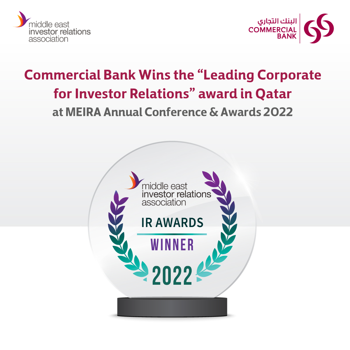 Commercial Bank Wins the “Leading Corporate for Investor Relations” award in Qatar at MEIRA Annual Conference & Awards 2022