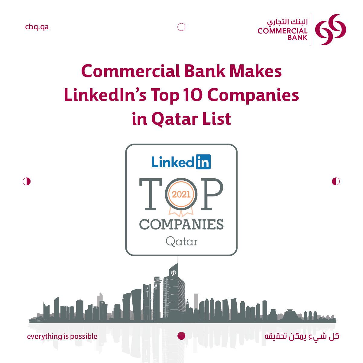 Doha, Qatar: Commercial Bank, the most innovative bank in Qatar, is ranked 5th on LinkedIn's list of the 10 best workplaces to grow your career in Qatar for 2021.
